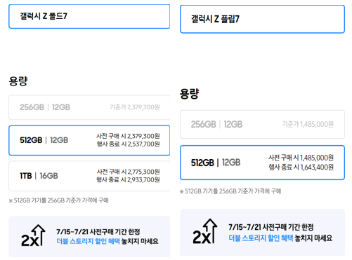 갤럭시 Z 폴드7의 경우, 12GB 메모리 기준 256GB는 237만 9300원, 512GB 253만 7700원 그리고 16GB 메모리 탑재 1TB 모델은 293만 3700원으로 공개 되었는데, 플립7은 가격이 그대로이지만, 폴드7은 이전 모델 대비 약 15만원 정도 인상되었다고 보도 되었습니다.